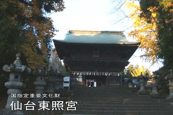 この東照宮は、久能山や日光の東照宮が権現造りであるのに対し、本殿・拝殿を別棟に配している点で著しく様式が異なっています。本殿・唐門・透塀(すきべい)・鳥居が国の重要文化財に指定されており、随身門と手水舎が宮城県の文化財に指定されています。いずれも承応3年の創建で当時の最高技術がいかされています。鳥居も備前岡山から石材を取寄せし社殿の建造に大工延べ13万人、人夫58万人、費用は二万二千五百両を費やしたといわれ伊達文化の粋を集めたものとなっています。