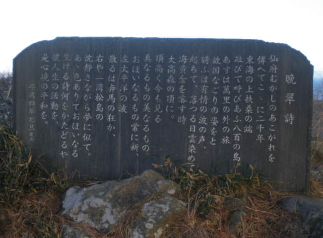 荒城の月で知られる土井晩翠が大高森を登ったおり、ここからの眺めに感嘆し詠んだうたが碑に刻まれています。