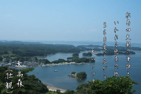 大高森は松島四大観の筆頭にあげられる景勝の地であり、周囲と比べひときわ小高い山頂からは360度の大パノラマが楽しめます。西から南にかけては松島湾に浮かぶ数々の島々が、東には嵯峨渓の島々と広大な太平洋が、北には海水浴場で知られる野蒜(のびる)海岸と遠くに石巻の市街地の遠景を一望できます。まさに壮観の名にふさわしい松島一の絶景です。