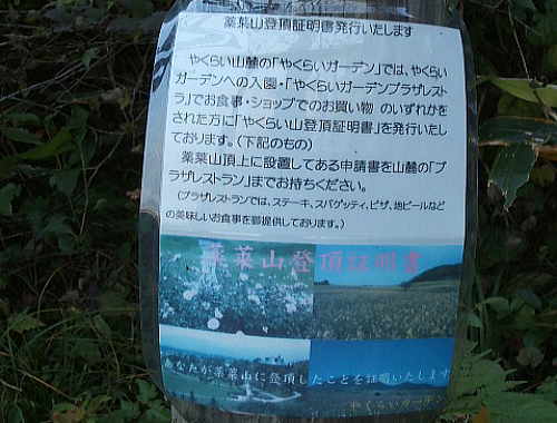 二の鳥居を入ってすぐ、写真にあるポスターを発見しました。これによれば、山頂置いてある申請書に必要事項を書き込んで申請すると登山証明書を発行してくれるらしい。 |