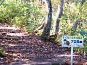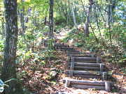階段は途中で急な坂道となり再び階段が続きます。少し歩いては休憩を繰り返し登っていきます。当然、坂道の部分は階段の段数には数えられません・・・・。中腹を過ぎると加美町指定の天然記念物のブナ・サワグルミ・トチの木の原生林が見られます。 |