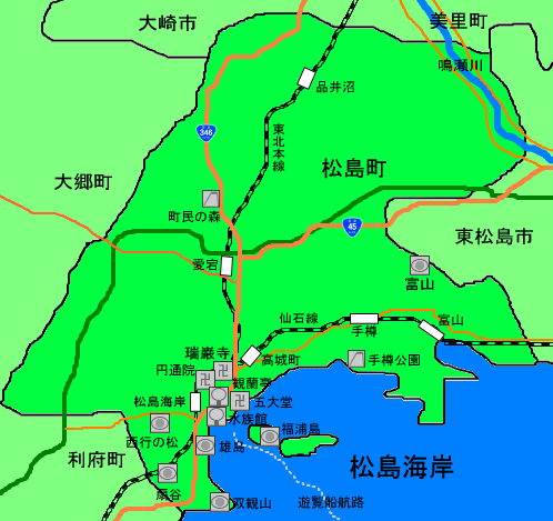 富山は町内東部にある山で、別名を麗観といい松島四大観に数えられ松島湾の全景をほぼ正面から一望できる景勝地として知られています。 |