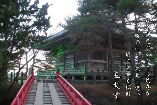 大同二年(807)、坂上田村麻呂がこの地にきたとき、松島の海の美しさに魅せられ、多聞天を祀って建てらた一小堂が開基と伝えられ、当時は毘沙門堂とよばれていました。寺地は、松島地方最古の仏跡とされています。その天長五年(828)に円仁(えんにん)が延福寺(現瑞巌寺)を開基した際、大聖不動尊を正面に五大明王像を安置したことから、五大堂とよばれるようになりました。現在の堂は、慶長九年(1604)に伊達政宗が再築したもので、方三間・単層、屋根宝形造・本瓦葺きとなっており国の重要文化財に指定されています。内部には平安前期の作風をとどめる一木造の五大明王像が安置されており、境内には松島雪月記・覚祖高蹊碑があります。堂の周囲はあまり広くはありませんが、松島湾に臨んだ景勝地に建つため、参拝する人の姿が絶えることはありません。陸地とは小さな島を挟んで、二本の渡り橋で結ばれており、途中の小島には「類聚国史」(るいじゅう)にも記されている古社松島八幡の祠があります。