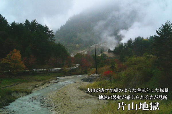 片山地獄は鳴子温泉郷の北側にある鬼首(おにこうべ)にいくつかある名前に地獄のつく場所の一つで、硫黄や蒸気の噴き出す荒涼とした光景は名前の通り地獄を思わせるものがあります。この場所は明治から昭和初頭にかけて硫黄鉱山として最盛期には800人もの人が精錬に携わっていたといいます。その後、この地の地熱を利用して日本で4番目の鬼首地熱発電所が昭和50年に稼働しました。