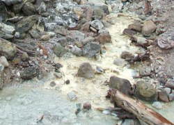片山地獄は大部分が発電所の敷地となっており立ち入り禁止となっているのですが、発電所脇の沢沿いの小道を奥へ進んでいくと通称「奥の院」と呼ばれるV字の谷があります。ここは野湯マニアの人たちには有名な場所だそうで、沢全体が温泉になっています。硫黄のにおいのする白濁色のお湯が特徴で、この湯を目指して訪れる人も少なくないそうです。ただ野湯のため脱衣所などの設備は当然なく、女性が入浴するには大変厳しいものがあります。