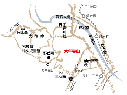 | 大年寺山(だいねんじ)は、別名「茂ヶ崎山」と言われ、仙台市南部広瀬川南岸の標高100m余の向山丘陵の東端部にあります。 昔、「野出口山」とも言い、室町時代の応永年間(1394年〜1428年)には、当時この付近を支配していた粟野大膳大夫の居城茂ヶ崎城があったそうです。 頂上部には伊達家4代藩主からの歴代藩主とゆかりの人々の墓所、仙台市大年寺山配水所、NHK、仙台放送、東日本放送、宮城テレビのテレビ塔、となりに野草園があります。 仙台市指定文化財になっております。 |